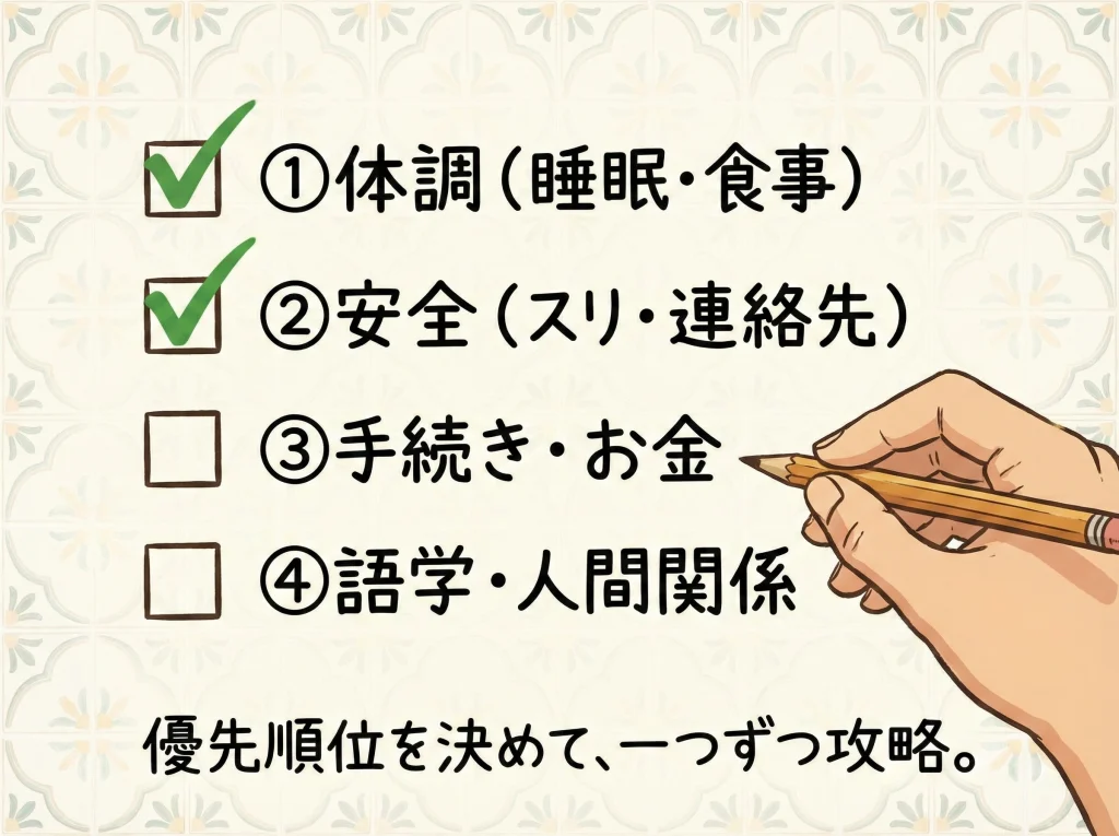 困った時は、①体調(睡眠と食事)を整える ②安全(スリ対策と連絡先)を固める ③手続きとお金を整理する ④語学と人間関係を小さく回す、の順番で立て直すと戻りやすいです。